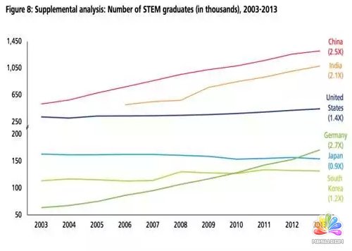 下圖是過去10年STEM(Science, Technology, Engineering, Mathematics)大學畢業(yè)生的人數(shù)成長。中國的基數(shù)最大,增速也很快。